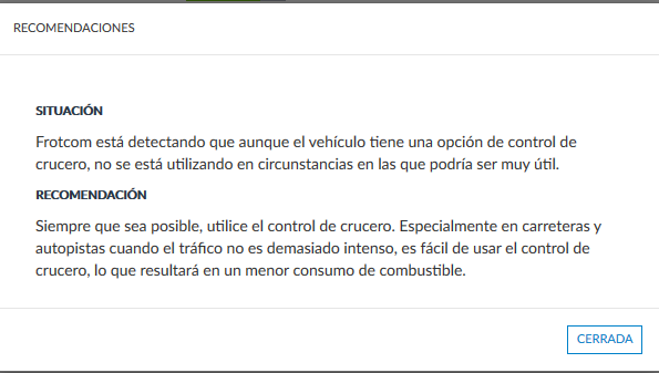 Si clickamos en la parte más izquierda se nos abrirá un desplegable(ver imagen a continuación), donde Frotcom nos dará alguna recomendación personalizada sobre este vehículo para mejorar el rendimiento.